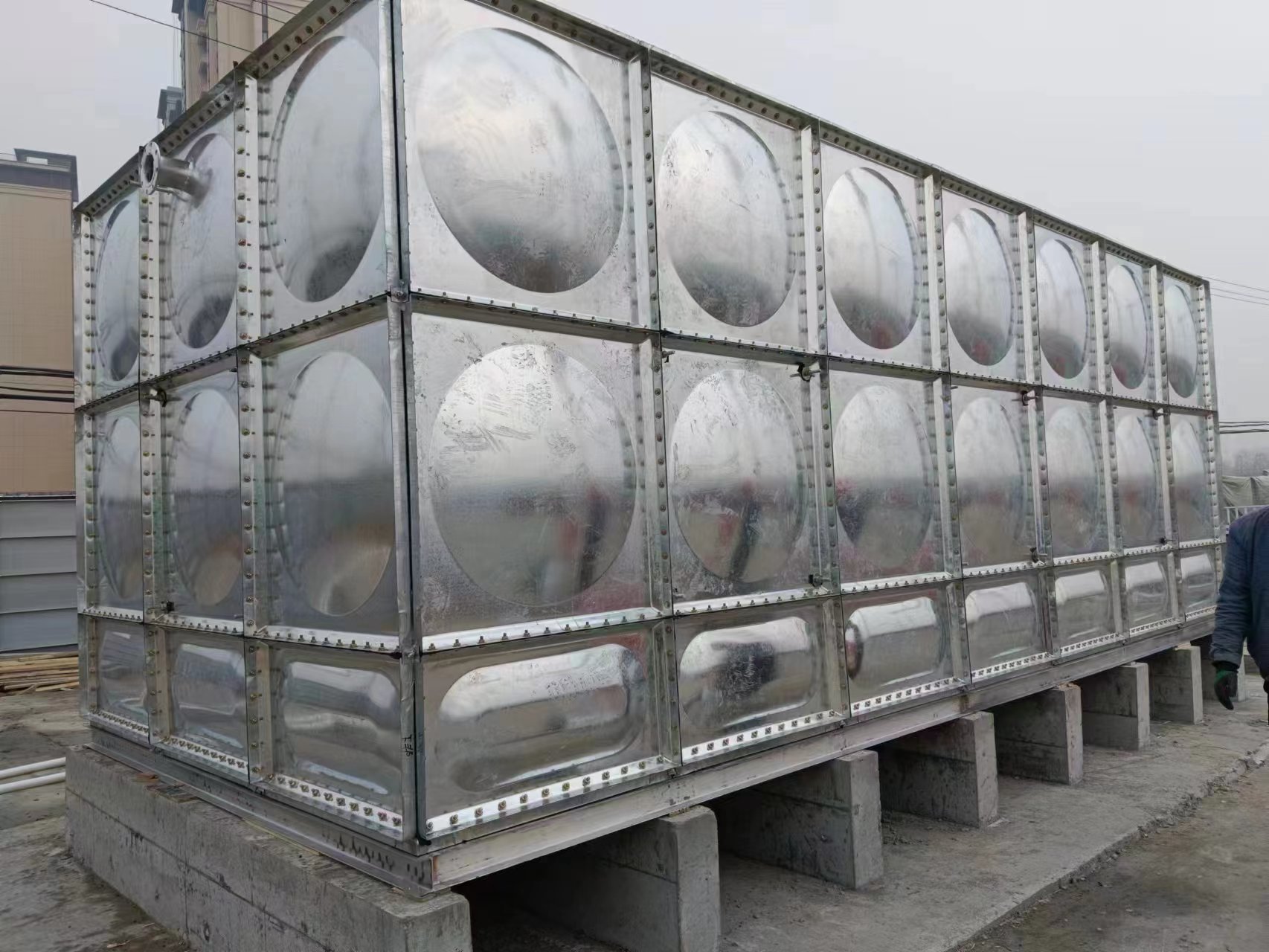 二、鍍鋅鋼板水箱的底板根據長寬高擺正好位置,然后用螺栓和膠條固定,依次是側板和頂板,我們在安裝鍍鋅鋼板水箱的底板前,要把鍍鋅鋼板水箱的拉筋與支撐安裝好,完成框架后,整體的鍍鋅鋼板水箱就安裝好了,我們就可以驗收使用鍍鋅鋼板水箱了。